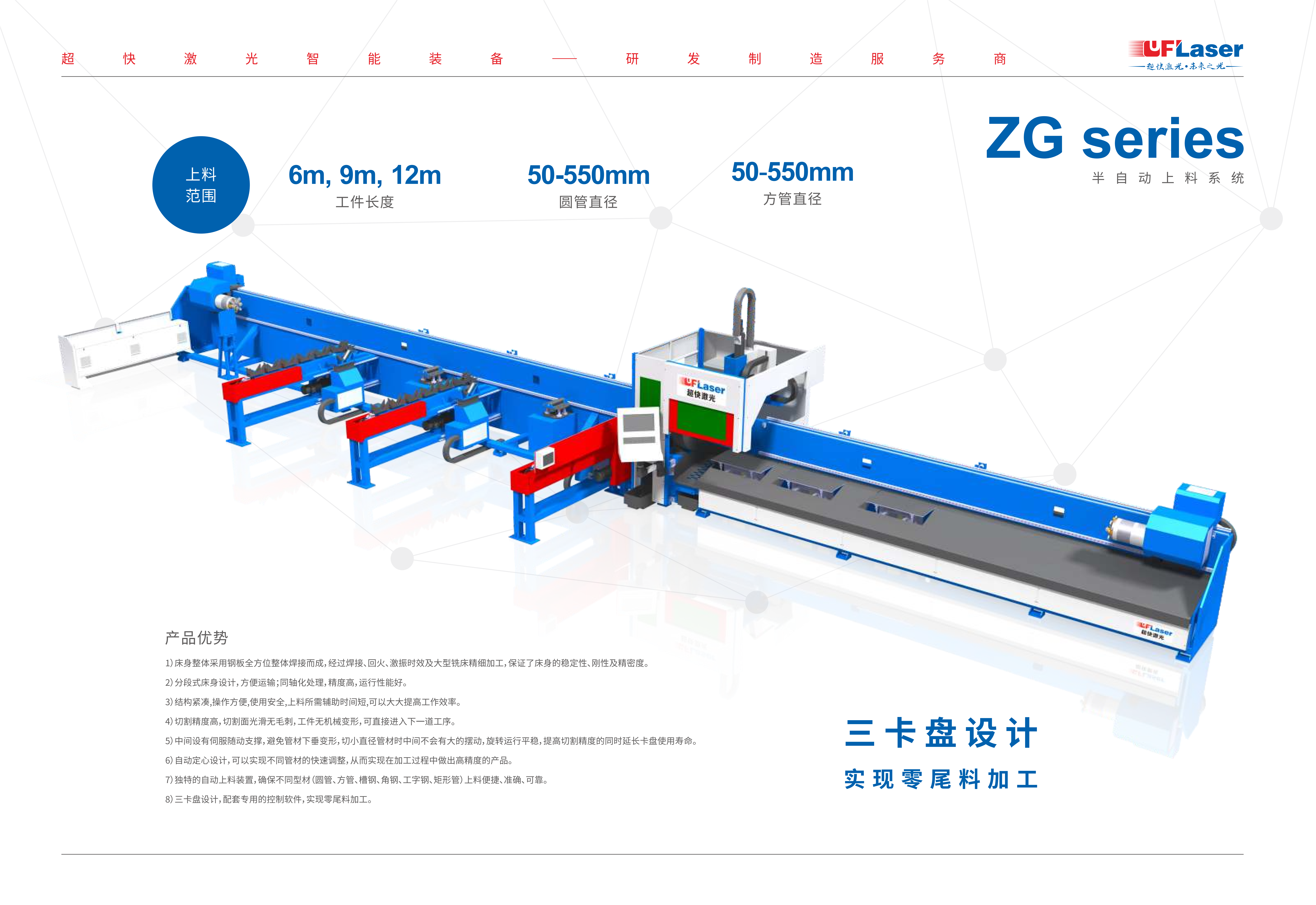 1.專用切管機采用三個自動夾盤設計,不受加工范圍限制實現(xiàn)零尾料。: